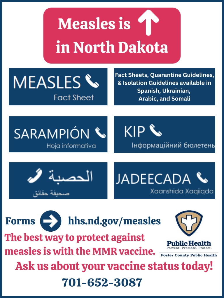 Information available in Spanish, Ukrainian, Somali, and Arabic. From the main ND Health & Human Services Measles page, scroll down past the exposure locations to “Measles Fact Sheets Translated to Other Languages” list.
